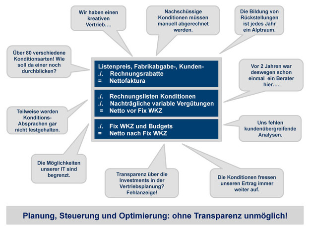 Häufig verfügen Hersteller und Lieferanten nicht über eine durchgängige Speicherung sämtlicher Konditionen und WKZ. Wichtige Fakten für die Planung und die operativen Vertriebsprozesse fehlen. Offensichtlich ist das Problem der mangelnden System-Möglichkeiten bei vielen Markenartiklern, Herstellern und Lieferanten der Hauptgrund, warum dieser Bereich stark vernachlässigt wird.