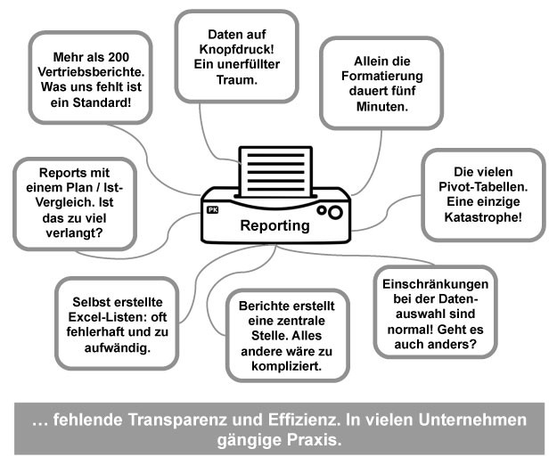 Mit 3 bis 4 Schritten soll der fertige Report in max. 10 Sekunden vorliegen - als druckfertiges Dokument oder als .pdf zum Speichern und Verschicken. Eine Gegenüberstellung der Ist-Ergebnisse vs. Plan, und in den Report integrierte clevere Kennzahlen sollten ebenfalls zum Standard gehören. Portfolio-Analysen und Vertriebssteuerung leicht gemacht, damit Sie Potentiale und Risiken sofort erkennen und zielgerichtet adressieren.